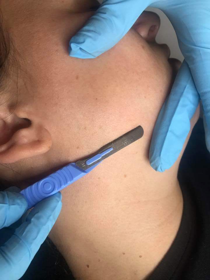 Removal of vellous hair and surface dead skin cells using surgical blade, leaving smooth, glowing skin. This is a great treatment for special occasions.